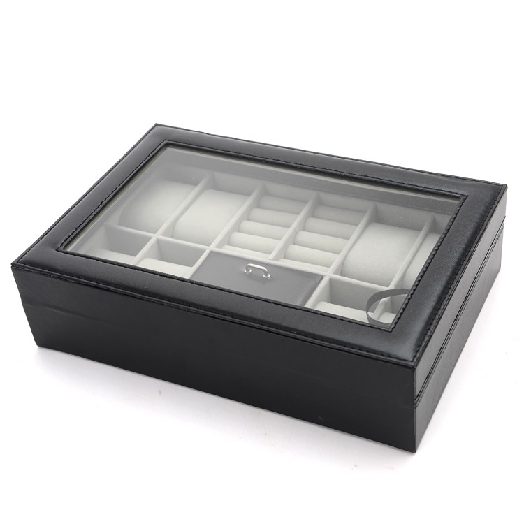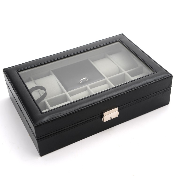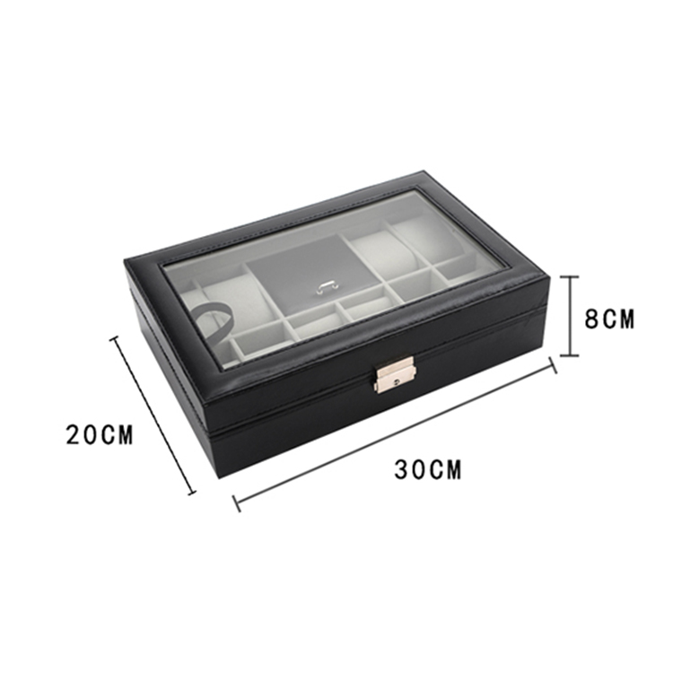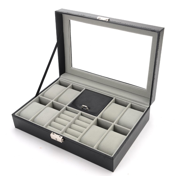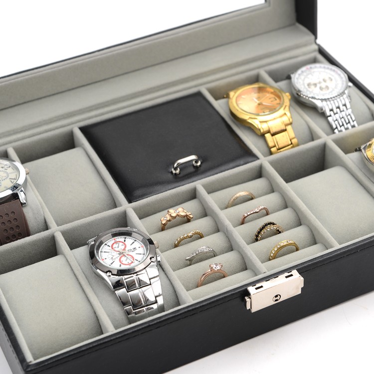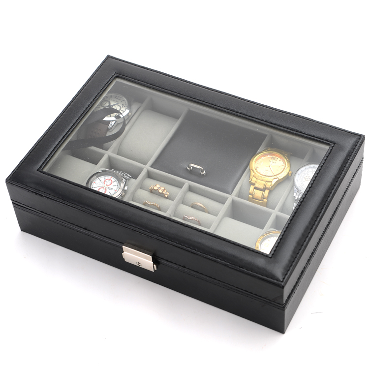 Product description:PU 8grids watch+2rows ring window opening watch jewelry box flat lock